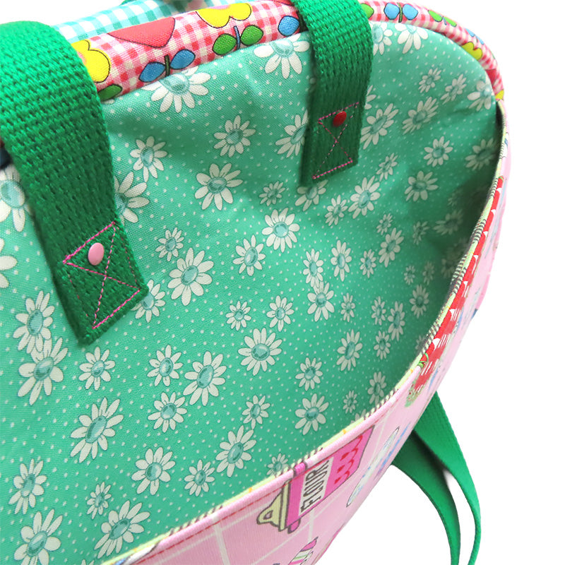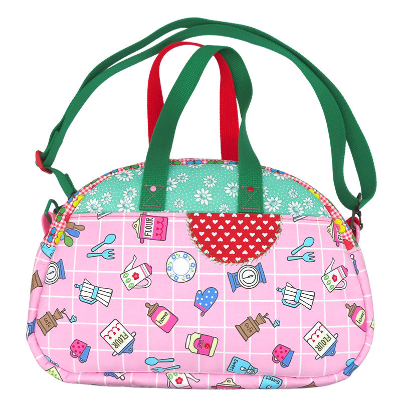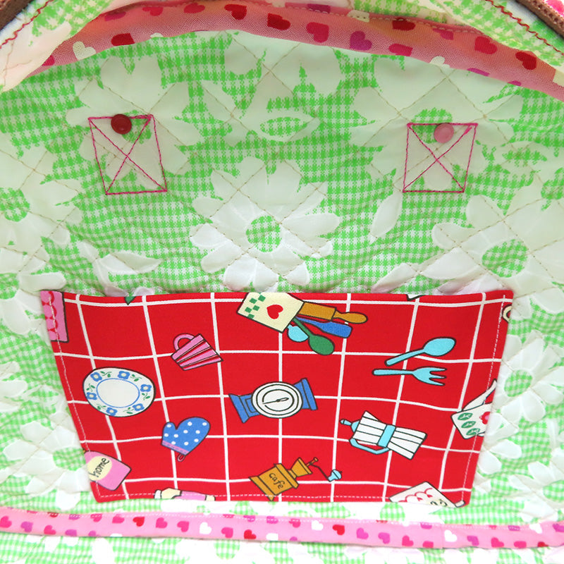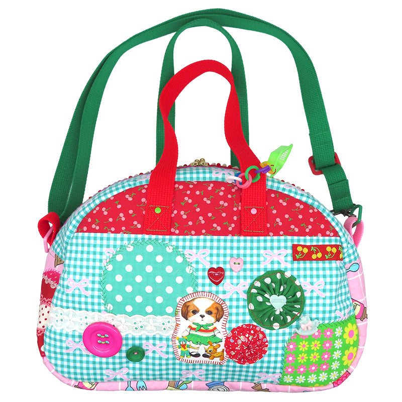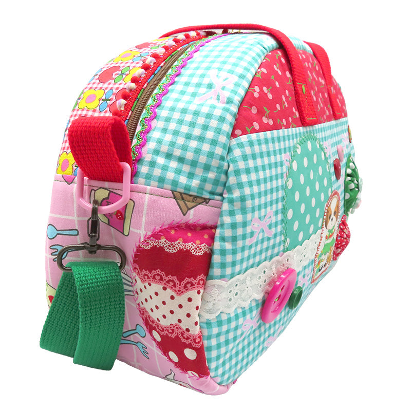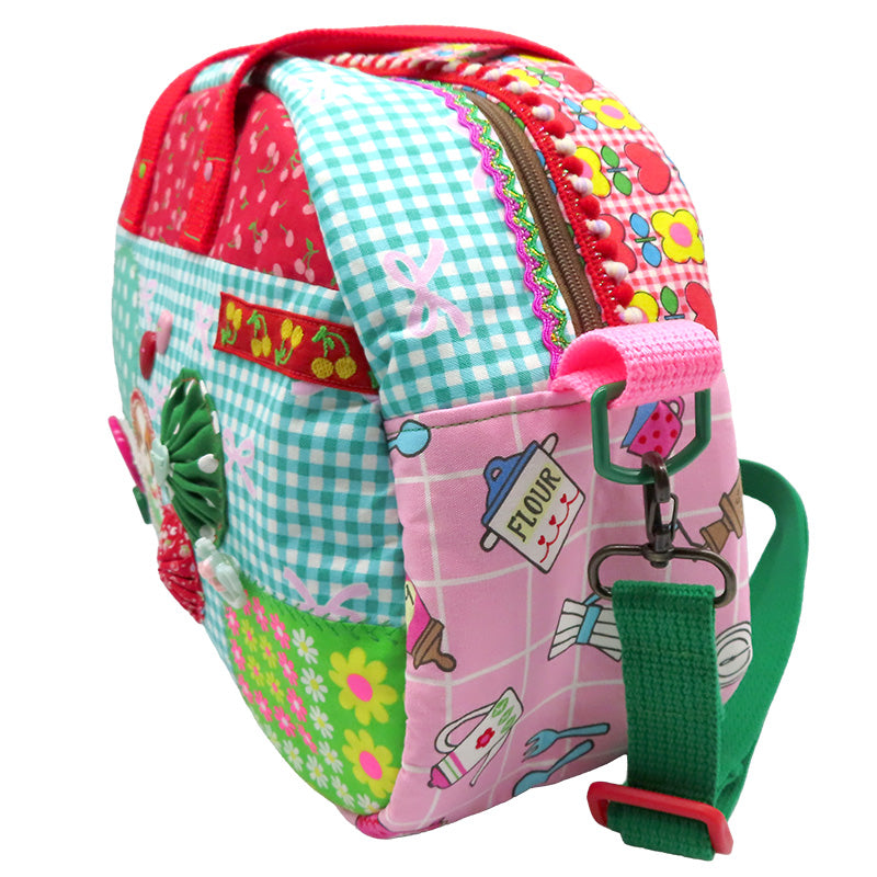 パッチワーク風のレトロプリント生地を使用し、ボタンやちょっぴり懐かしめのアクセサリーを装飾しています。