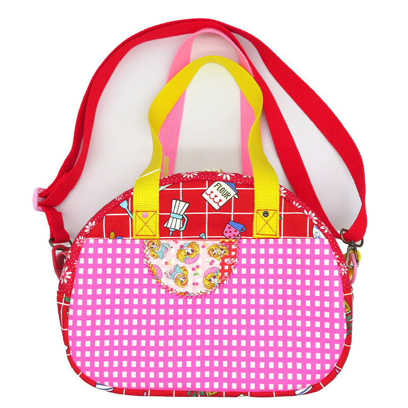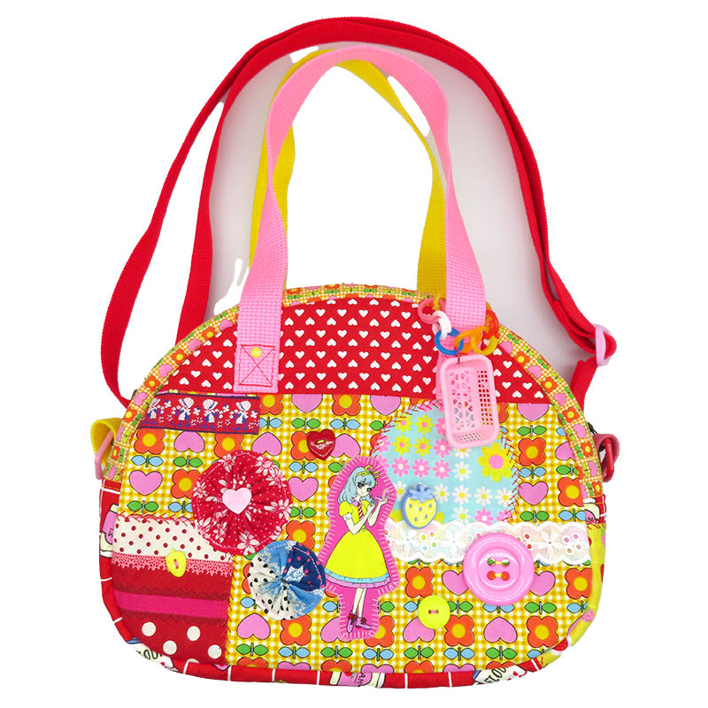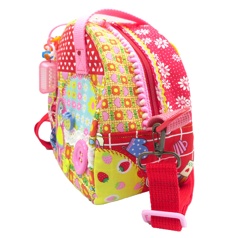 パッチワーク風のレトロプリント生地を使用し、ボタンやちょっぴり懐かしめのアクセサリーを装飾しています。