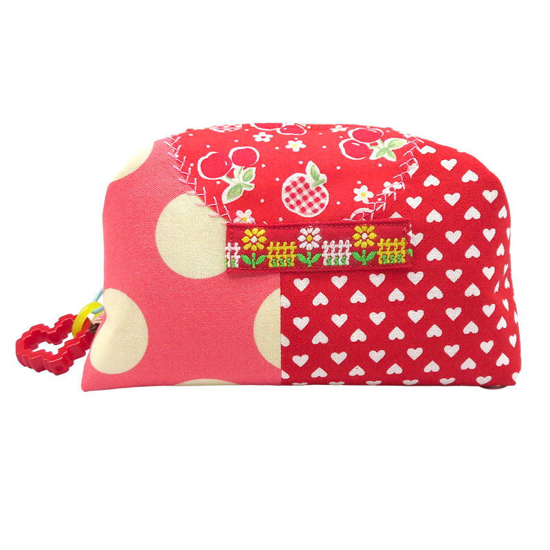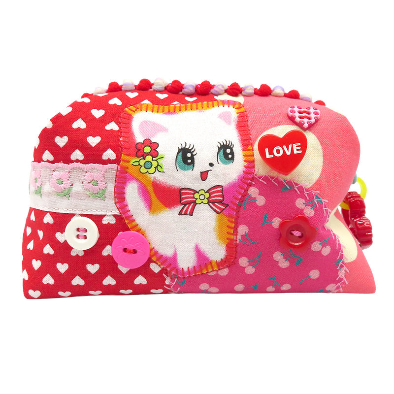 パッチワーク風のレトロプリント生地を使用し、レースやボタン、ちょっぴり懐かしめのアクセサリーを装飾しています。